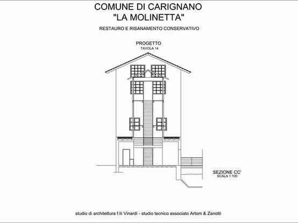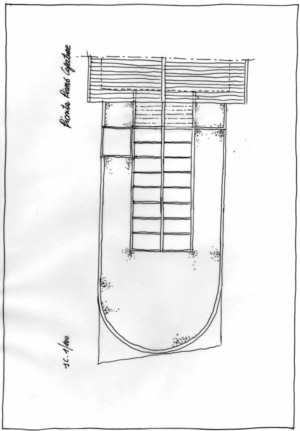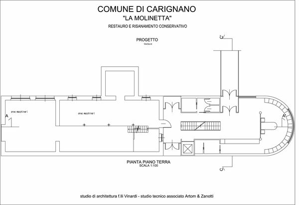 Il progetto prevede inoltre, se pur in dimensioni ridotte, la reimmissione dell’acqua nel canale esistente opportunamente restaurato. A medio termine si prevede la bonifica del canale con la riduzione dei carichi di portata e la sistemazione di un percorso attrezzato a fianco del rio. Attraverso il ponte si raggiunge lo spazio dove oggi sono presenti degli orti, che verranno eliminati realizzando una nuova sistemazione a verde. In un secondo tempo si è ipotizzato il completo restauro e riutilizzo degli ingranaggi delle turbine.