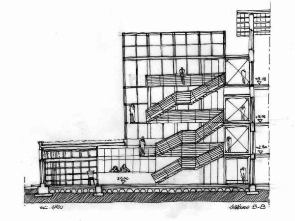 Le norme di legge per rendere accessibile e visitabile anche ai disabili il Mulino hanno orientato la progettazione verso uno schema spaziale che prevede i collegamenti verticali, localizzati in un blocco di nuova costruzione in struttura metallica e rivestimento ligneo, esterno al Mulino. Poichè gli spazi interni vincolati dalla presenza dei macchinari, non consentono di risolvere il problema dei collegamenti tra i vari piani con l’inserimento all’interno della costruzione, di nuove scale e ascensore senza stravolgere la situazione strutturale esistente.