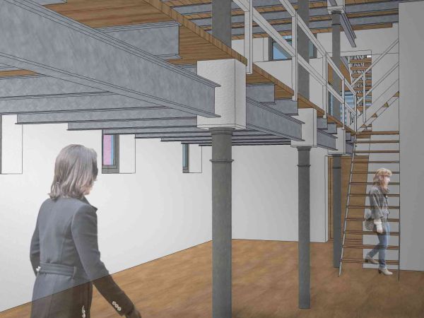 Le norme di legge per rendere accessibile e visitabile anche ai disabili il Mulino hanno orientato la progettazione verso uno schema spaziale che prevede i collegamenti verticali, localizzati in un blocco di nuova costruzione in struttura metallica e rivestimento ligneo, esterno al Mulino. Poichè gli spazi interni vincolati dalla presenza dei macchinari, non consentono di risolvere il problema dei collegamenti tra i vari piani con l’inserimento all’interno della costruzione, di nuove scale e ascensore senza stravolgere la situazione strutturale esistente.